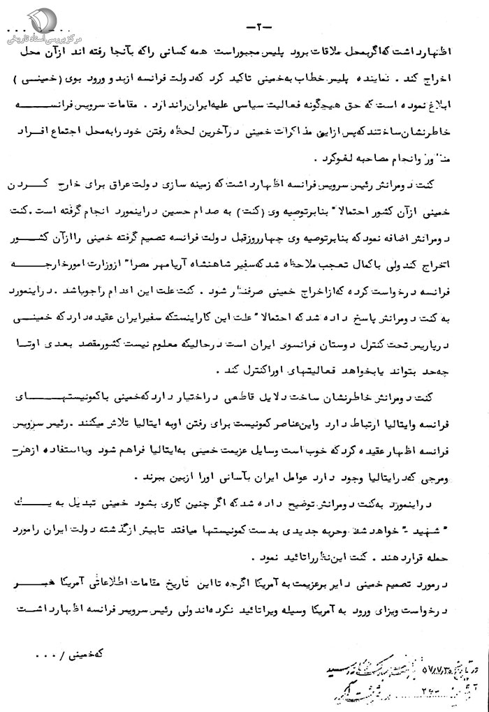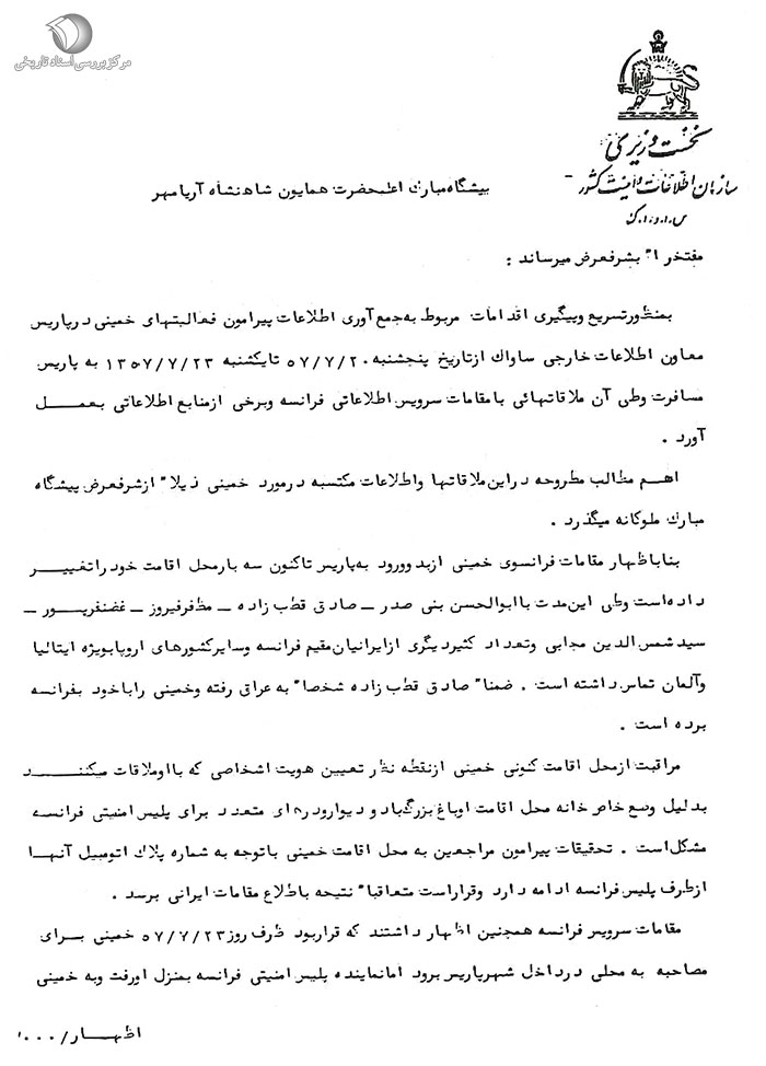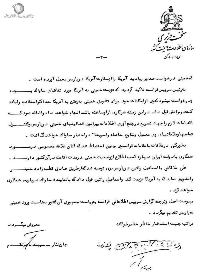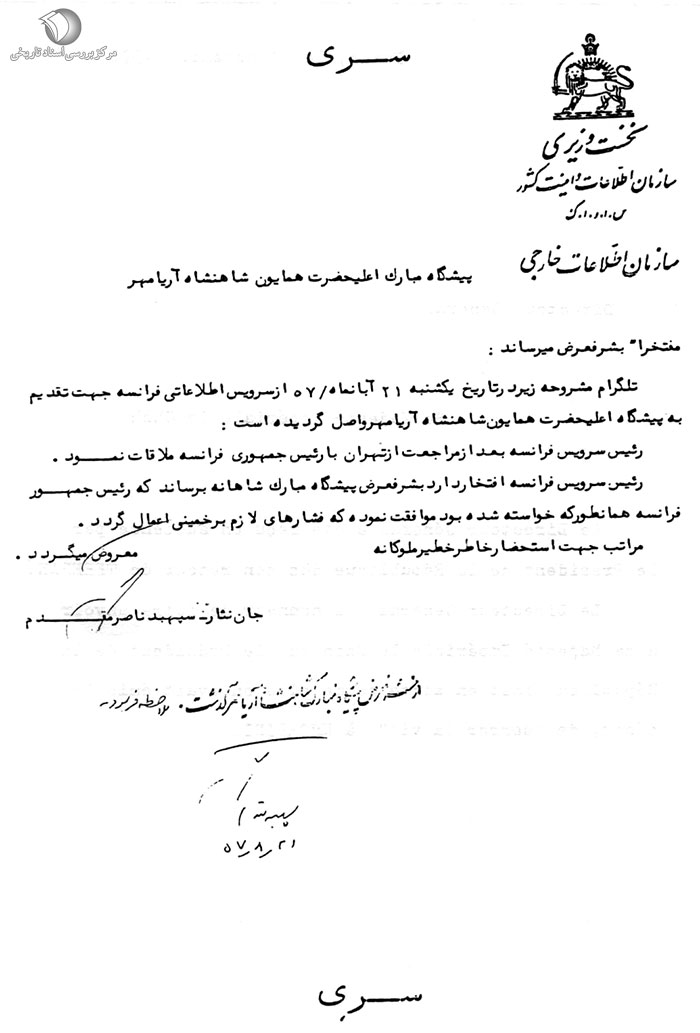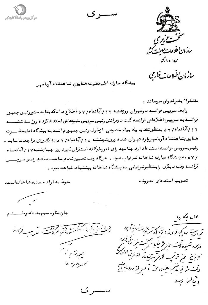 رئیس سرویس فرانسه افتخار دارد به شرف عرض پیشگاه مبارک شاهانه برساند که رئیس جمهور فرانسه همان طور که خواسته شده بود موافقت نموده که فشارهای لازم بر خمینی اعمال گردد.