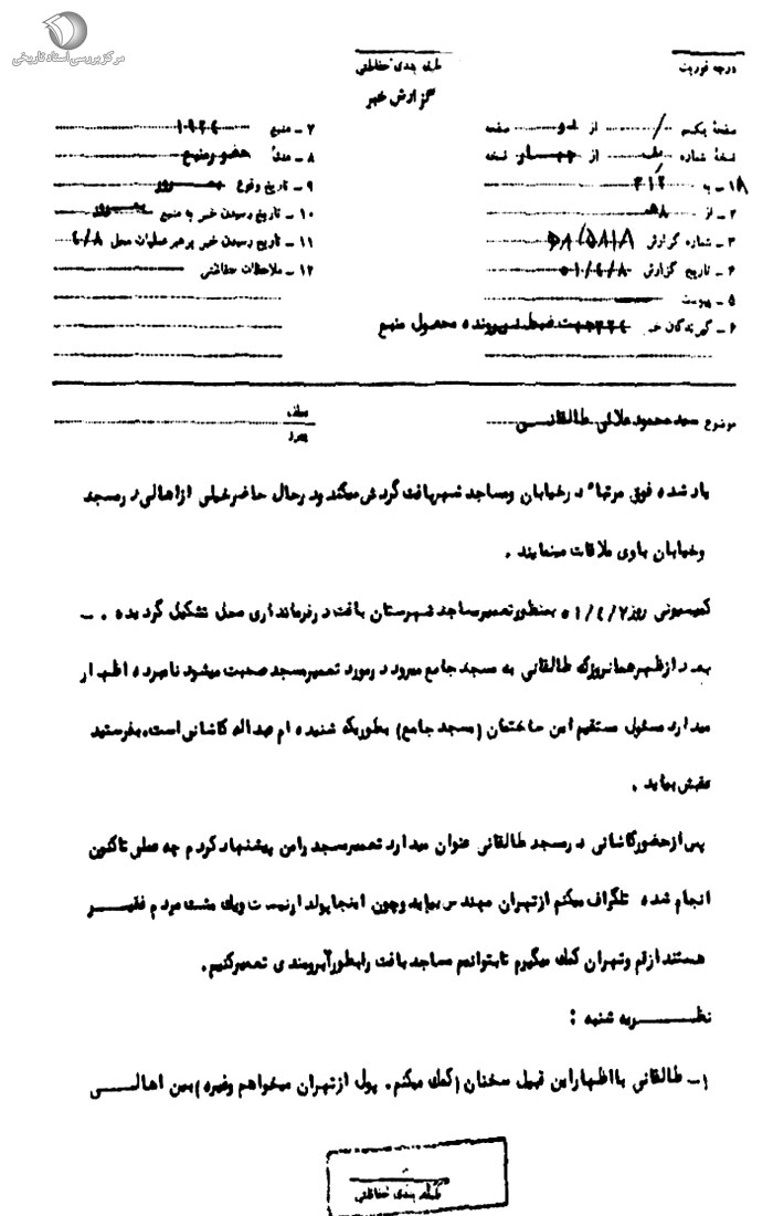1ـ طالقانی با اظهار این قبیل سخنان (کمک میکنم. پول از تهران میخواهم و غیره) بین اهالی ساده لوح موقعیت مناسبی کسب نموده است و همه از وی تعریف مینمایند.