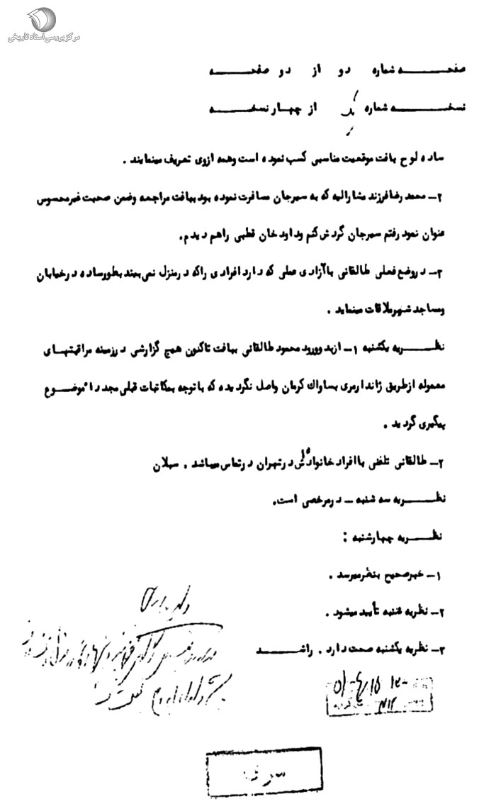1ـ از بدو ورود محمود طالقانی به بافت تاکنون هیچ گزارشی در زمینه مراقبتهای معموله از طریق ژاندارمری به ساواک کرمان واصل نگردیده که با توجه به مکاتبات قبلی مجدداً موضوع پیگیری گردید.