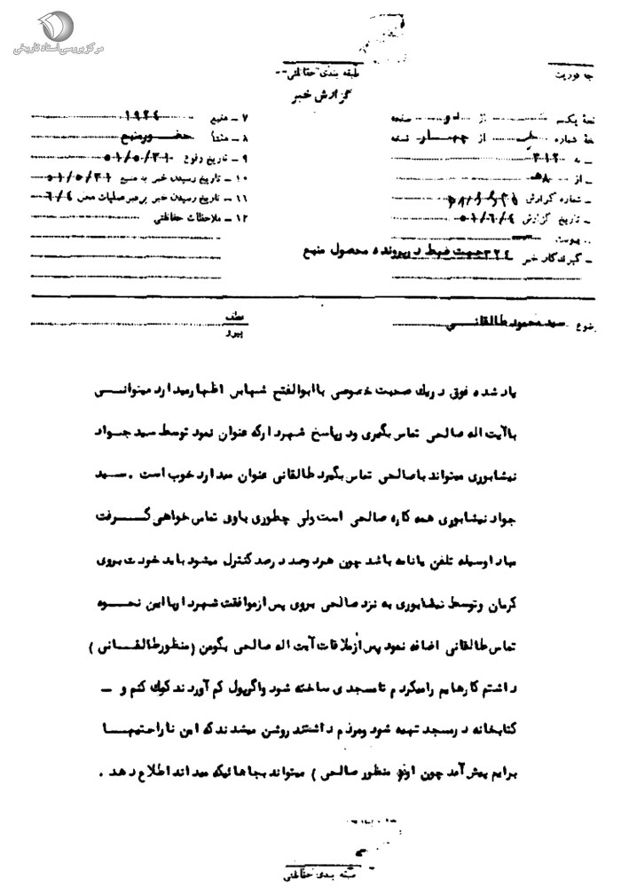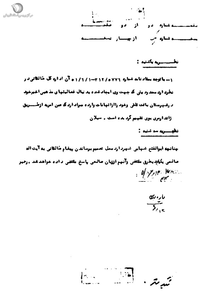 چنانچه ابوالفتح شهابی شهردار محل تصمیم به رساندن پیغام طالقانی به آیتاله صالحی بنماید به طرق مقتضی و آن هم از زبان صالحی پاسخ مقتضی داده خواهد شد. رهبر دایره بررسی ـ 13 / 6