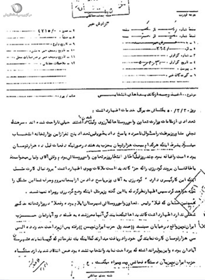 روز 30 / 3 / 50 بکتاش مدیرکل خدمات اظهار داشت: تعدادى از مقامات وزارت تعاون و امور روستاها که آرزوى وکیل شدن را داشتند خیلى ناراحت شدهاند، سرهنگ نجفى مشاور وزیر علت را سؤال [کرده] نام برده پاسخ داد: به طور یقین تعداد پنج نفر از این وزارتخانه انتخاب میشود، به شرط این که هر کدام بیست هزار تومان به حزب بدهند. در صورتى که دفعات قبل ده هزار تومان بوده است و اضافه نمود چند روز قبل دراتاق انتظار وزیر تعاون و امور روستایى بودم وقتى آقاى ولیان میخواستند به اتاقشان بروند گودرزى را که جزء کاندیداهاست ملاقات [کرد] و به وى اظهار داشت: «برو دنبال کارت مثل این که این کار گیرى دارد» گودرزى به آقاى وزیر پاسخ داد: من ازاینجا نمیروم و حرف شما این مشکل را حل خواهد کرد. سپس اظهار نظر کرد که: با این گفته وزیر مثل این که وضع گودرزى رو به راه نمیباشد.