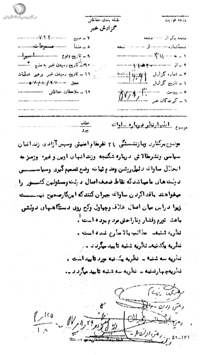 موضوع برکنارى و بازنشستگى 34 نفر مقام امنیتى و سپس آزادى زندانیان سیاسى و نشر مقالاتى درباره شکنجه و زندانهاى اوین و غیره و زمزمه انحلال ساواک دلیل روشن و عدم ثبات وضع تصمیمگیرى و سیاسى دولتهاى ما میباشد که نقاط ضعف اعمال دولت و مسئولین کشور را میخواهند با فدا کردن ساواک جبران کنند که این کار صحیح نیست زیرا در این میان اعمال خلاف و چپاول و کجروى دستگاههاى دولتى باعث تورم و فشار و ناراحتى مردم بوده است.