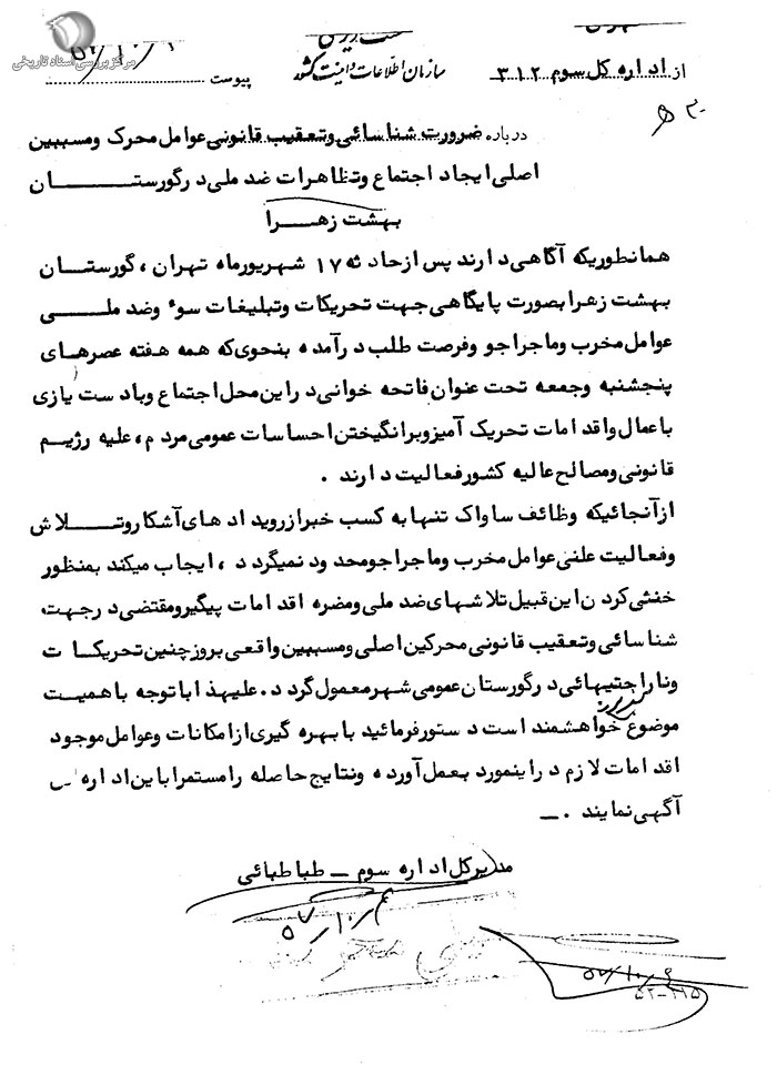از آن جائی که وظائف ساواک تنها به کسب خبر از رویدادهاى آشکار و تلاش و فعالیت علنى عوامل مخرب و ماجراجو محدود نمیگردد، ایجاب میکند به منظور خنثى کردن این قبیل تلاشهاى ضد ملى و مضره اقدامات پیگیر و مقتضى در جهت شناسائى و تعقیب قانونى محرکین اصلى و مسببین واقعى بروز چنین تحریکات و ناراحتیهائى در گورستان عمومى شهر معمول گردد. علیهذا با توجه به اهمیت موضوع به فرموده خواهشمند است دستور فرمائید با بهرهگیرى از امکانات و عوامل موجود اقدامات لازم در این مورد به عمل آورده و نتایج حاصله را مستمراً به این اداره کل آگهى نمایند.