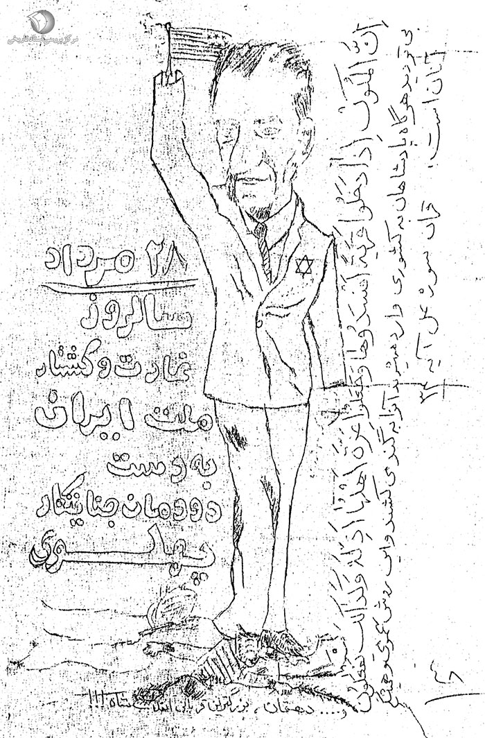 در دوران انقلاب اسلامى و در ایام مصادف با سالگرد کودتای 28 مرداد 32، کاریکاتورى از محمدرضا پهلوى، تهیه و توزیع شد که در دست او: پرچم امریکا و بر سینهاش: ستاره اسرائیل و زیر پاهایش، پیکر کشته شدگان قرار داشت و در ذیل آن نوشته شده بود: «و... دهقان، بزرگترین قربانى انقلاب شاه!!!» که اشاره به اصلاحات ارضى و ویرانى کشاورزى ایران داشت.