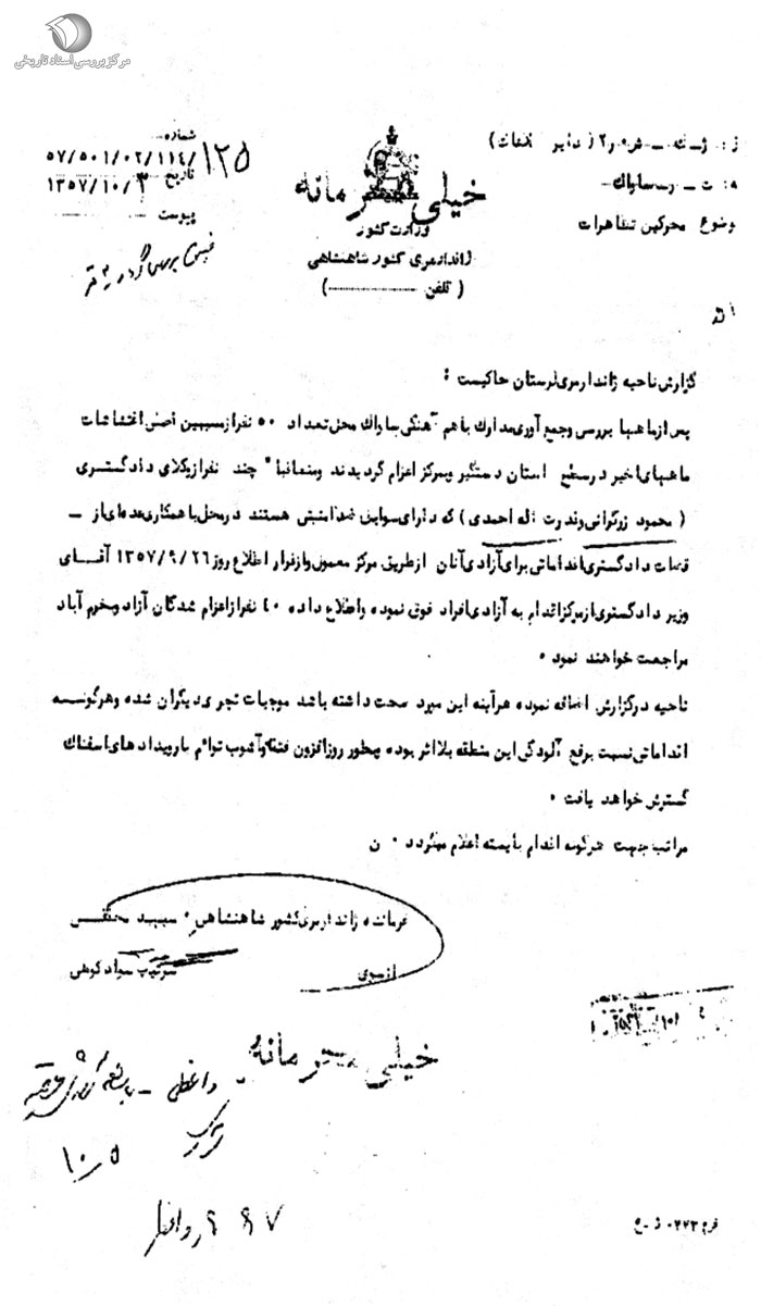 پس از ماهها بررسى و جمعآورى مدارک با همآهنگى ساواک محل تعداد 50 نفر از مسببین اصلى اغتشاشات ماههاى اخیر در سطح استان دستگیر و به مرکز اعزام گردیدند و متعاقباً چند نفر از وکلاى دادگسترى (محمود زرگرانى و قدرتاله احمدى) که داراى سوابق ضد امنیتى هستند در محل با همکارى عدهاى از قضات دادگسترى اقداماتى براى آزادى آنان از طریق مرکز معمول و از قرار اطلاع روز 26 / 9 / 1357 آقاى وزیر دادگسترى از مرکز اقدام به آزادى افراد فوق نموده و اطلاع داده 40 نفر از اعزام شدگان آزاد و به خرمآباد مراجعت خواهند نمود.