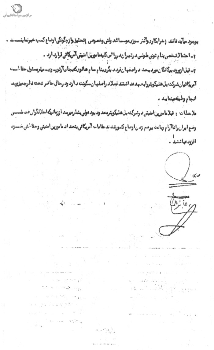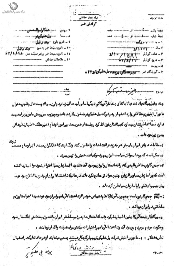 چندى قبل بیگانه یاد شده بالا به اتفاق چند نفر آمریکایى دیگر به اسامى «لید هاکینز ـ فرد وارن ـ چاک وست فال و فلچر» به عنوان مأموران امنیتى و حفاظتى وارد اصفهان و در شرکت بل هلیکوپتر مشغول به کار شدهاند و «جیمز وب» سرپرستى مأمورین را به عهده دارد. ضمناً خاطر نشان میسازد که بیگانگان فوقالذکر در جلسهاى ضمن بحث پیرامون اوضاع اخیر مملکت اظهار نظرهایى به شرح زیر نمودهاند.