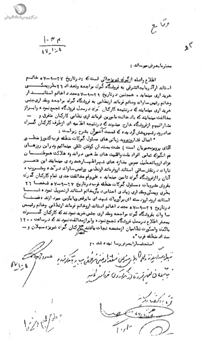 اطلاع واصله از گمرک تبریز حاکى است که: در تاریخ 27 ـ 9 ـ 57 خانم استاندار آذربایجان شرقى به فروشگاه گمرک مراجعه و تعداد 26 بطر ویسکى خریدارى مینماید. همچنین در تاریخ 29 ـ 9 ـ 57 مجدداً خانم استاندار و خانم رئیس ساواک و خانم فرماندار نظامى به فروشگاه گمرک مراجعه و مقدارى جنس خریدارى مینمایند که در نتیجه کارکنان گمرک در محل فروشگاه تجمع نموده و ابراز مخالفت مینمایند که با دخالت مأمورین فرماندارى نظامى کارکنان متفرق و مشارالیهم از فروشگاه خارج میشوند که در نتیجه اعلامیهاى از طرف کارکنان گمرک صادر و در شهر پخش گردیده که قسمت آخر آن به شرح زیر است:
