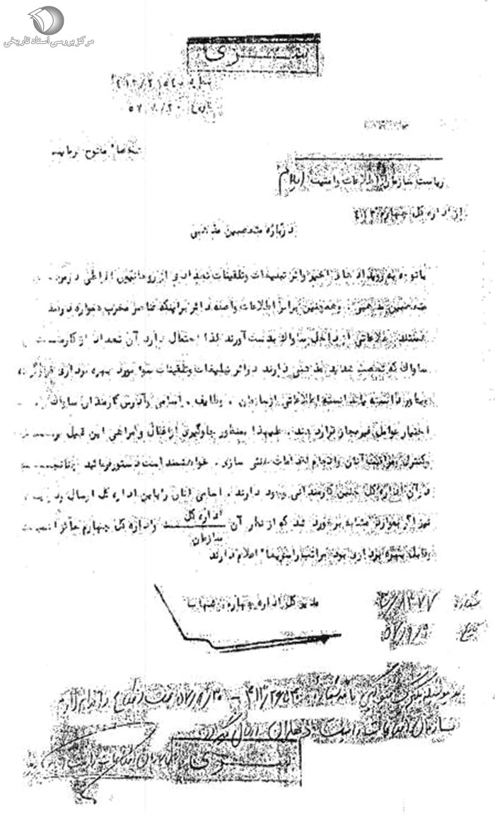 باتوجه به رویدادهاى اخیر و اثر تبلیغات و تلقینات تعدادى از روحانیون افراطى در مردم به ویژه متعصبین مذهبى و همچنین برابر اطلاعات واصله دائر براین که عناصر مخرب همواره در صدد هستند اطلاعاتى از داخل ساواک به دست آورند، لذا احتمال دارد آن تعداد از کارمندان ساواک که تعصب شدید مذهبى دارند در اثر تبلیغات و تلقینات سوء مورد بهرهبردارى قرار گرفته و به طور دانسته یا ندانسته اطلاعاتى از سازمان، وظایف، اسامى و آدرس کارمندان ساواک را در اختیار عوامل غیرمجاز قرار دهند. علیهذا به منظور جلوگیرى از اغفال و گمراهى این قبیل پرسنل و کنترل و مراقبت آنان و انجام اقدامات خنثىسازى، خواهشمند است دستور فرمائید چنانچه در آن اداره کل چنین کارمندانى وجود دارند اسامى آنان را به این اداره کل ارسال و در آینده نیز اگر به موارد مشابه برخورد شد که از نظر آن اداره کل سازمان و اداره کل چهارم حائز اهمیت و قابل بهرهبردارى بود مراتب را سریعا اعلام دارند.