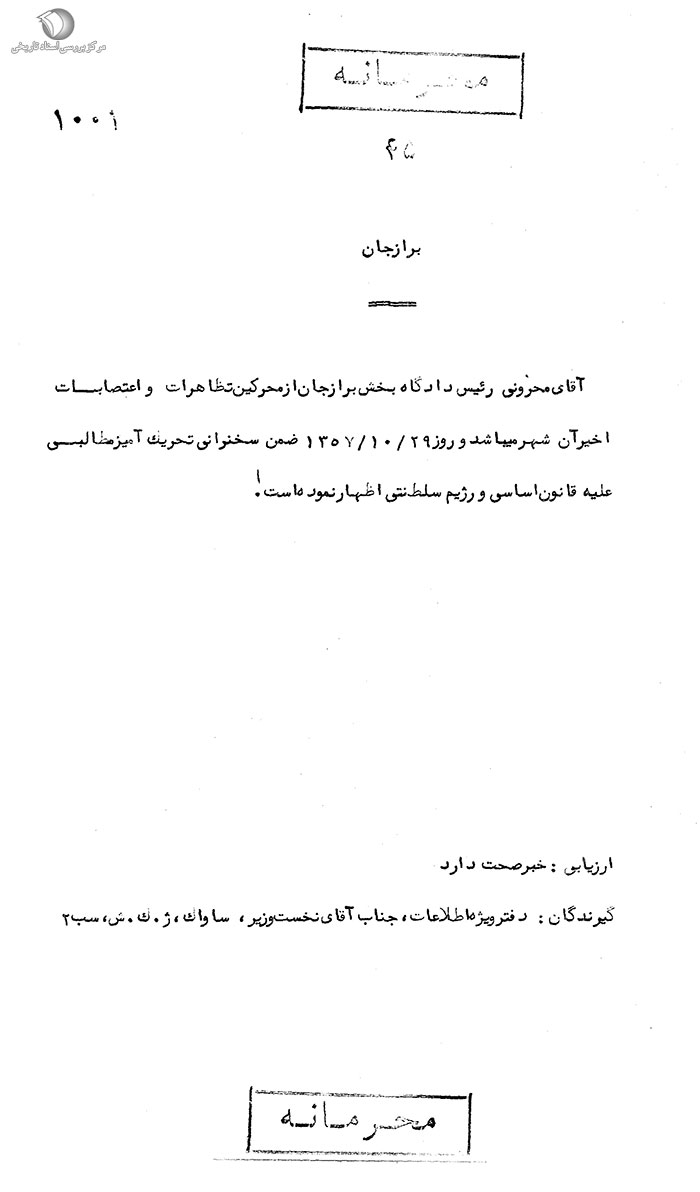 آقاى محزونى رئیس دادگاه بخش برازجان از محرکین تظاهرات و اعتصابات اخیر آن شهر میباشد و روز 29 / 10 / 1357 ضمن سخنرانى تحریکآمیز مطالبى علیه قانون اساسى و رژیم سلطنتى اظهار نموده است.