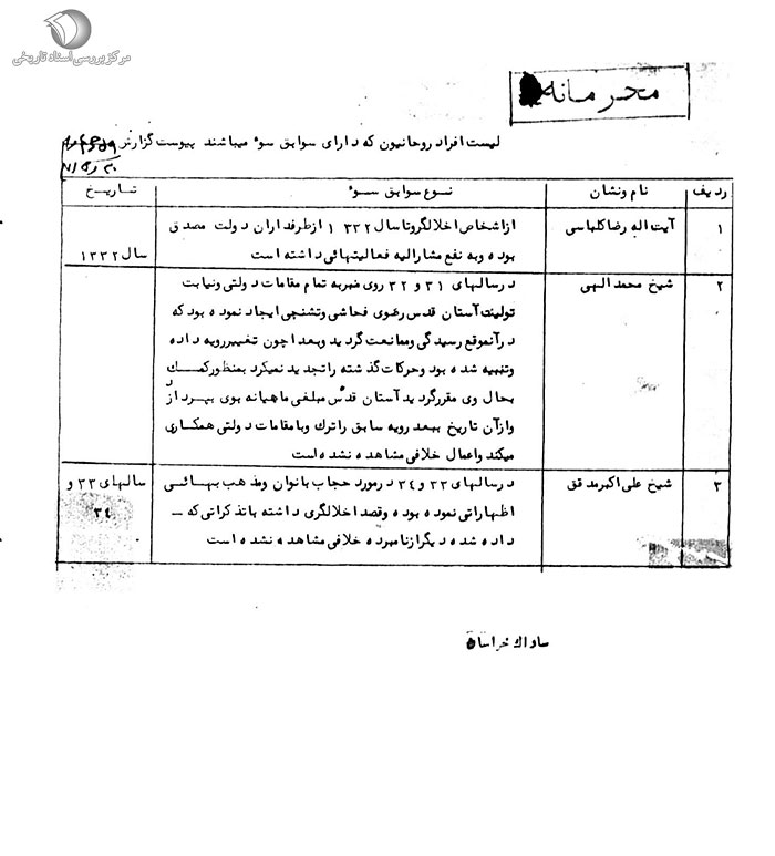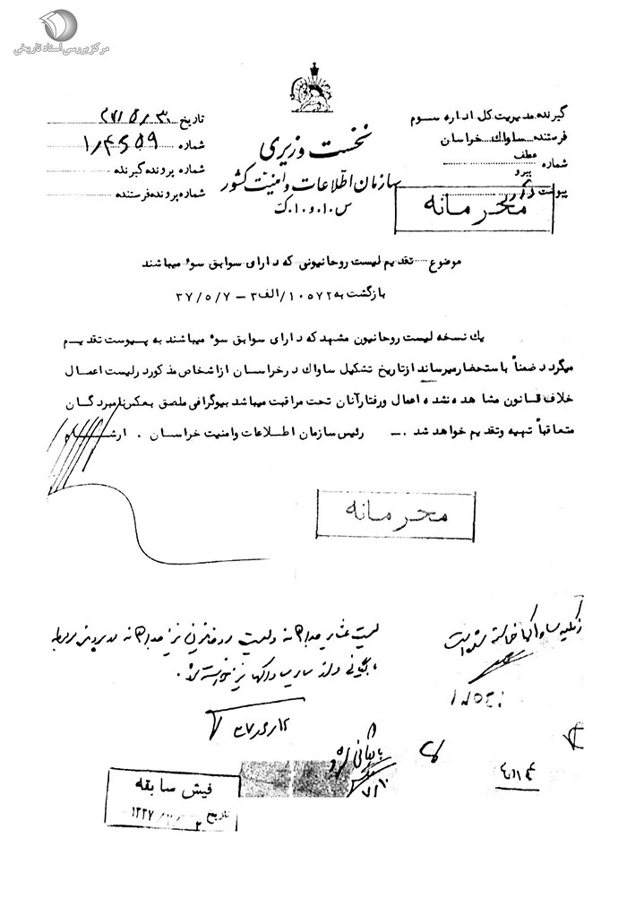 یک نسخه لیست روحانیون مشهد که دارای سوابق سوء میباشند به پیوست تقدیم میگردد. ضمناً به استحضار میرساند از تاریخ تشکیل ساواک در خراسان از اشخاص مذکور در لیست، اعمال خلاف قانون مشاهده نشده، اعمال و رفتار آنان تحت مراقبت میباشد. بیوگرافی ملصق به عکس نامبردگان متعاقباً تهیه و تقدیم خواهد شد.