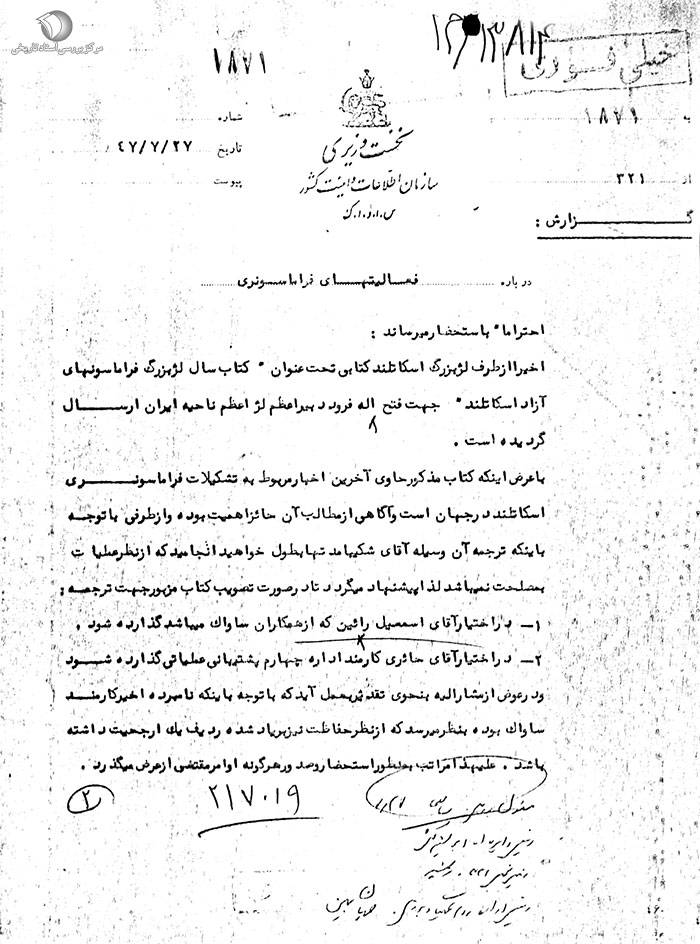 با عرض این که کتاب مذکور حاوی آخرین اخبار مربوط به تشکیلات فراماسونری اسکاتلند در جهان است و آگاهی از مطالب آن حائز اهمیت بوده و از طرفی با توجه به این که ترجمه آن وسیله آقای شکیبا مدتها به طول خواهید انجامید که از نظر عملیات به مصلحت نمیباشد لذا پیشنهاد میگردد تا در صورت تصویب کتاب مزبور جهت ترجمه: