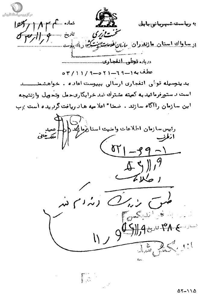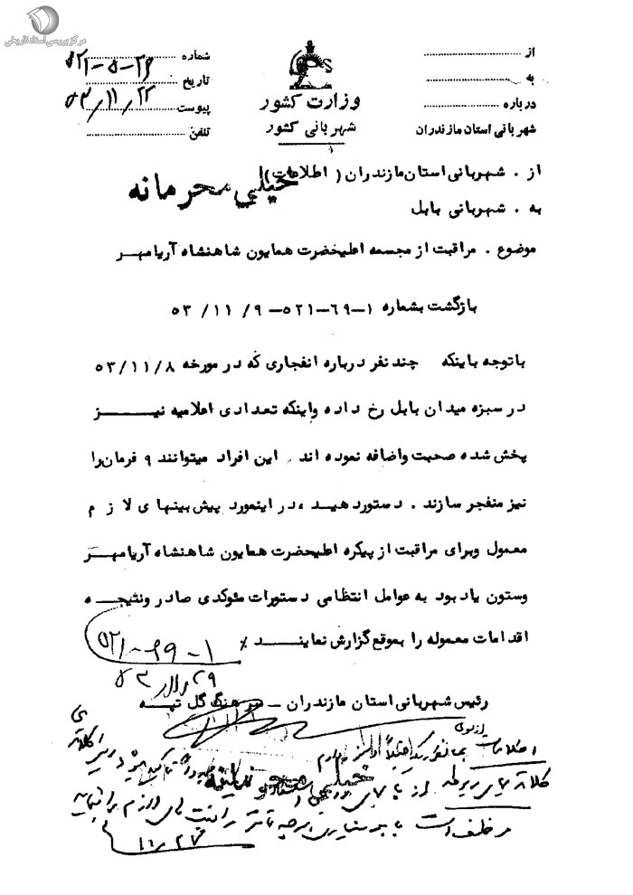 با توجه به این که چند نفر درباره انفجاری که در مورخه 8 / 11 / 53 در سبزه میدان بابل رخ داده و این که تعدادی اعلامیه نیز پخش شده صحبت و اضافه نمودهاند این افراد میتوانند 9 فرمان را نیز منفجر سازند، دستور دهید، در این مورد پیشبینیهای لازم معمول و برای مراقبت از پیکره اعلیحضرت همایون شاهنشاه آریامهر و ستون یادبود به عوامل انتظامی دستورات مؤکدی صادر و نتیجه اقدامات معموله را به موقع گزارش نمایند.