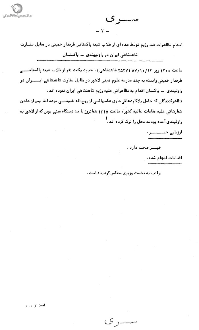 ساعت 1200 روز 13 / 10 / 57 (2537 شاهنشاهى)، حدود یکصد نفر از طلاب شیعه پاکستانى طرفدار خمینى وابسته به چند مدرسه علوم دینى لاهور در مقابل سفارت شاهنشاهى ایران در راولپندى ـ پاکستان اقدام به تظاهراتى علیه رژیم شاهنشاهى ایران نمودهاند.