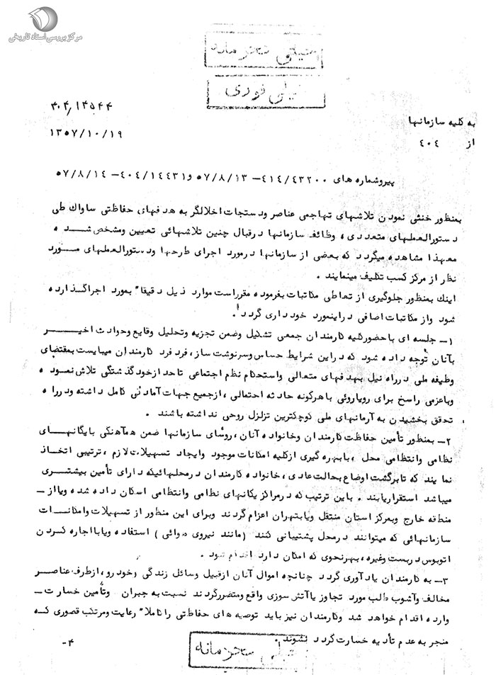 بخشنامه ساواک به مراکز مربوطه برای حفاظت از ساختمانها، کارکنان و مدارک محرمانه در سال 1357