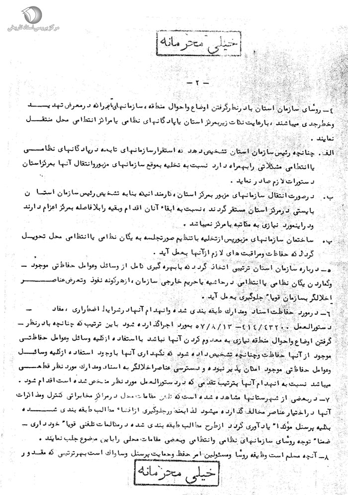 5 ـ درباره سازمان استان ترتیبى اتخاذ گردد که با بهرهگیرى کامل از وسائل و عوامل حفاظتى موجود و گماردن یگان نظامى یا انتظامى در حاشیه یا حریم خارجى سازمان، از هرگونه نفوذ و تعرض عناصر اخلالگر به سازمان قویاً جلوگیرى به عمل آید.