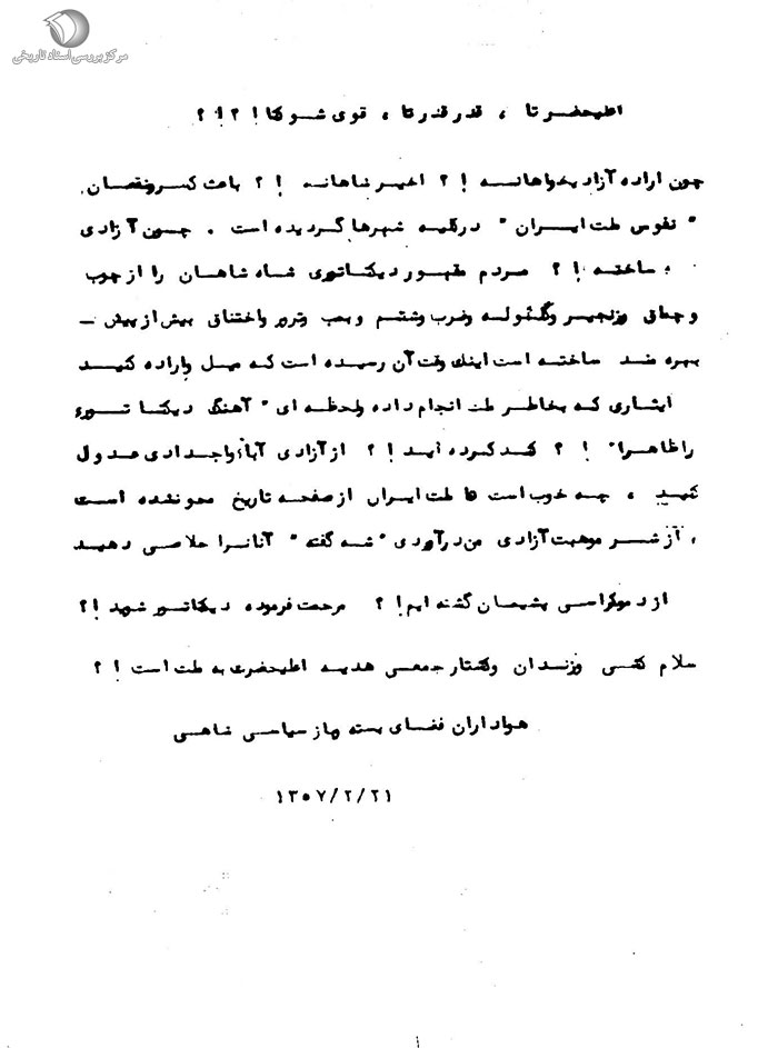 چون اراده آزادیخواهانه!؟ اخیر شاهانه!؟ باعث کسر و نقصان "نفوس ملت ایران" در کلیه شهرها گردیده است. چون آزادی خود ساخته!؟ مردم مقهور دیکتاتوری شاه شاهان را از چوب و چماق و زنجیر و گلوله و ضرب و شتم و بمب و ترور و اختناق بیش از پیش بهرهمند ساخته است اینک وقت آن رسیده است که میل و اراده کنید و از ایثاری که به خاطر ملت انجام داده و لحظهای آهنگ دیکتاتوری را ظاهراً!؟ کُند کردهاید!؟ از آزادی آباء و اجدادی عدول کنید، چه خوب است تا ملت ایران از صفحه تاریخ محو نشده است، از نشر موهبت آزادی من درآوردی "شه گفته" آنان را خلاصی دهید. از دموکراسی پشیمان گشتهایم!؟ مرحمت فرموده دیکتاتور شوید!؟ اسلامکشی و زندان و کشتار جمعی، هدیه اعلیحضرت به ملت است!؟