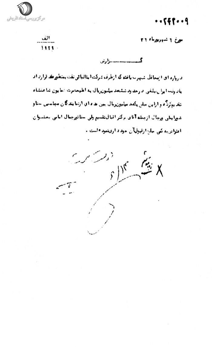 در پارهاى از محافل شهرت یافته که از طرف شرکت ایتالیایى نفت به منظور عقد قرارداد با دولت ایران مبلغى در حدود ششصد میلیون ریال به اعلیحضرت همایون شاهنشاه تقدیم گردیده و از این مبلغ یکصد میلیون ریال بین عدهاى از نمایندگان مجلسین سنا و شوراى ملى و رجال از جمله آقاى دکتر اقبال تقسیم ولى سناتور جمال امامى به عنوان اعتراض به کمى مبلغ از قبول آن خوددارى نموده است.