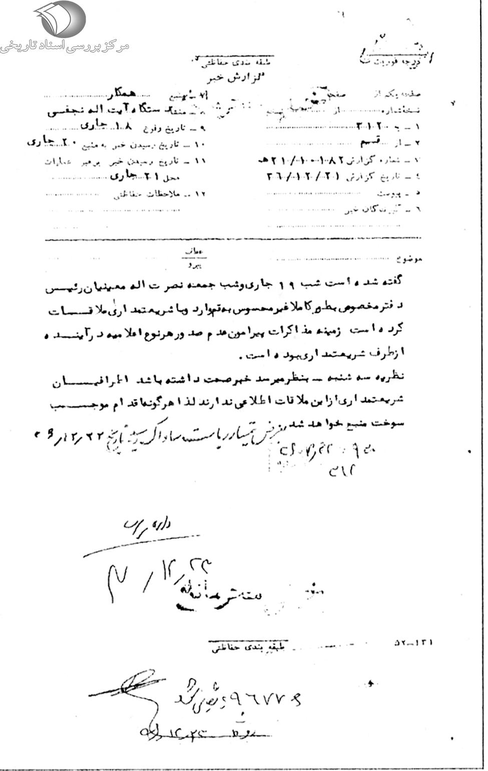 گفته شده است شب 19 جارى و شب جمعه نصرتاللّه معینیان رئیس دفتر مخصوص به طور کاملاً غیر محسوس به قم وارد و با شریعتمدارى[سیدکاظم شریعتمداری] ملاقات کرده است. زمینه مذاکرات پیرامون عدم صدور هر نوع اعلامیه در آینده از طرف شریعتمدارى بوده است.