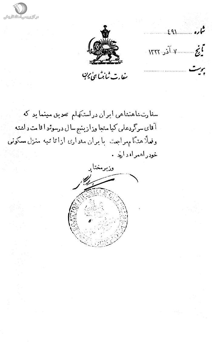 «سفارت شاهنشاهی ایران در استکهلم تصدیق مینماید که آقای سرگرد علی کیا متجاوز از پنج سال در سوئد اقامت داشته و فعلاً به هنگام مراجعت به ایران مقداری از اثاثیه منزل مسکونی خود را همراه دارند.»[13]