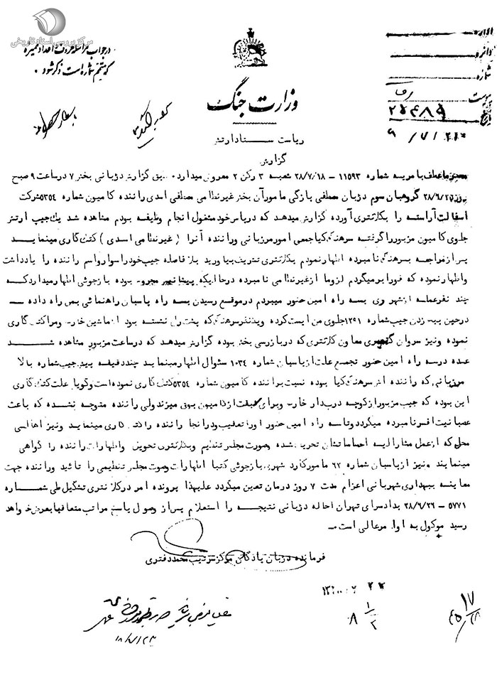 [239]. سند شماره: 11397 / ن - 12 / 7 / 1328 و سند شماره: 25485 / ق - 21 / 7 / 28، همان.