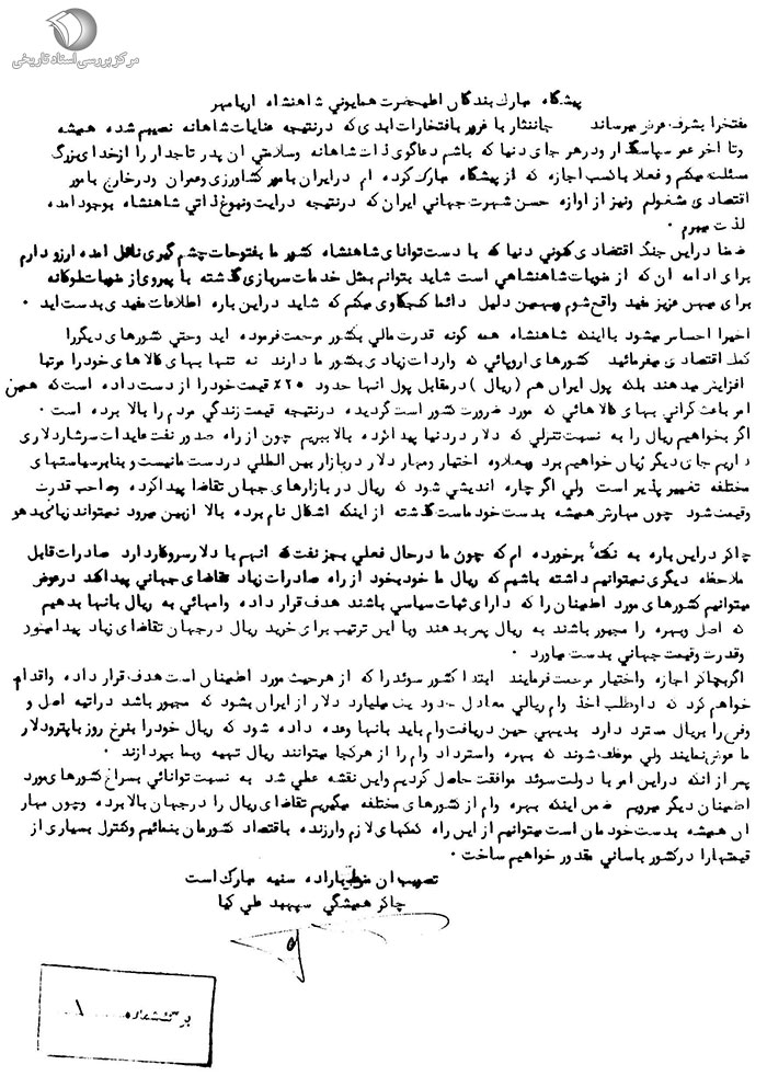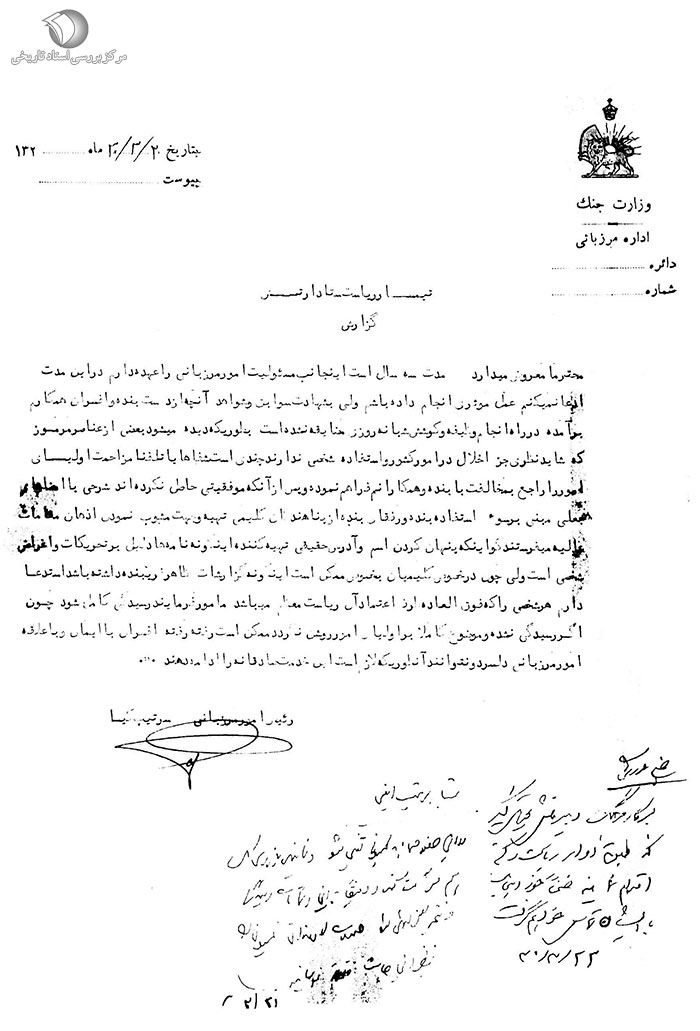 استدعا میشود نوع اطلاعاتی که بیشتر مورد نظر است مرقوم فرمایند تا مورد نظر بوده و با تجسس و بررسی بتوانم به قدر امکان در این راه کمک نمایم.»[27]