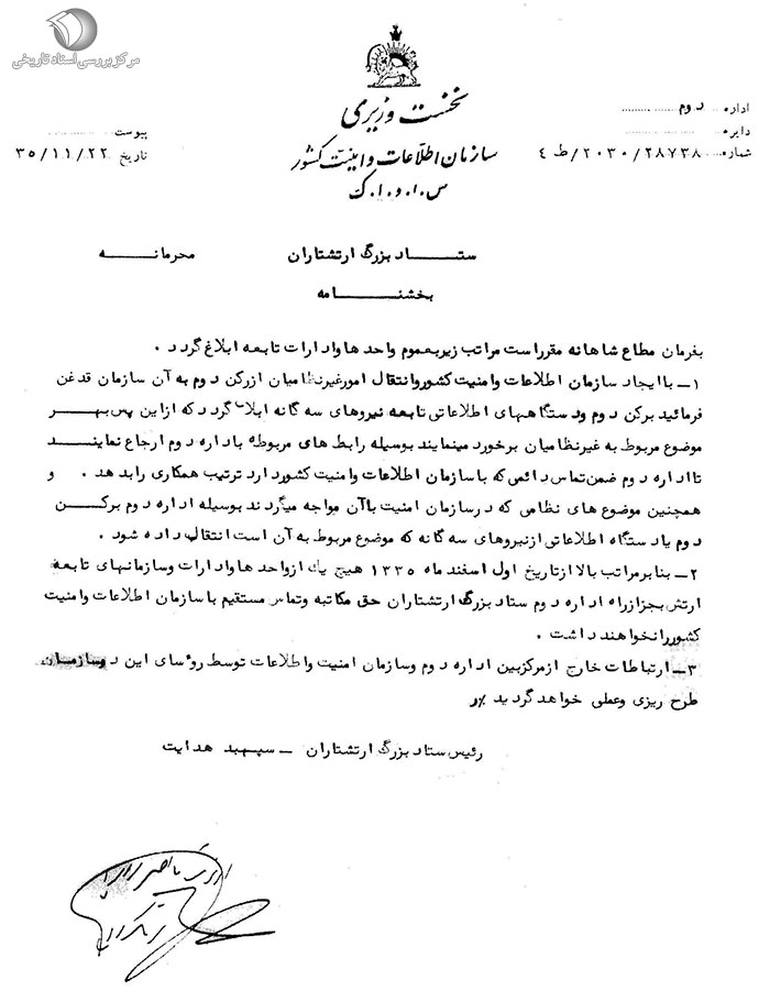 پس از این انتصاب بود که در سر برگ دفتر نظامی شاهنشاهی در نامهای به نخستوزیر نوشته شد: