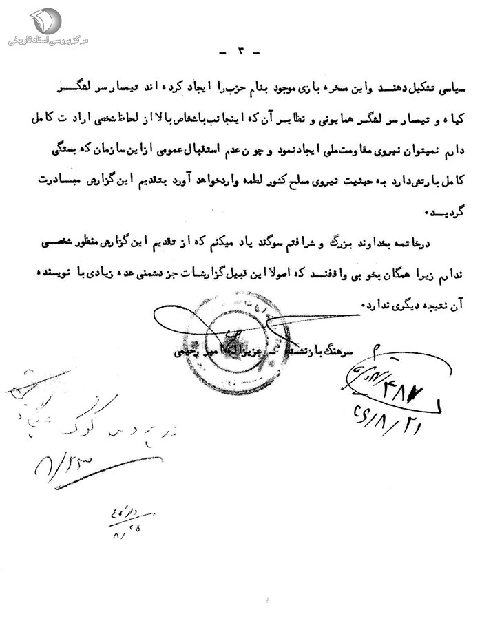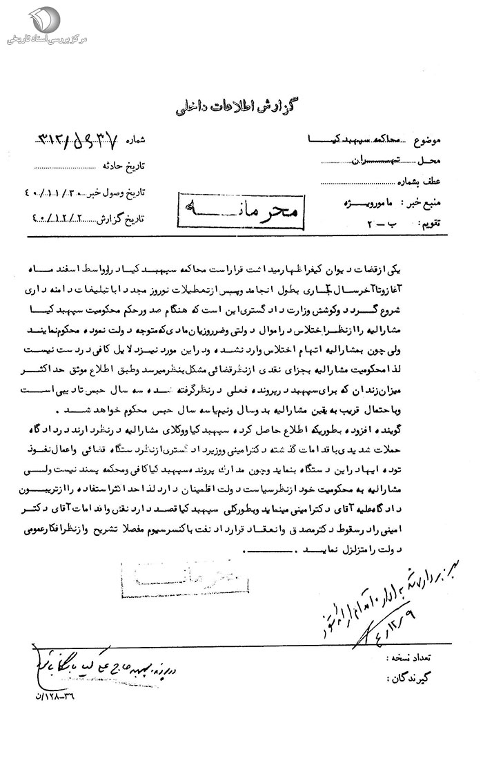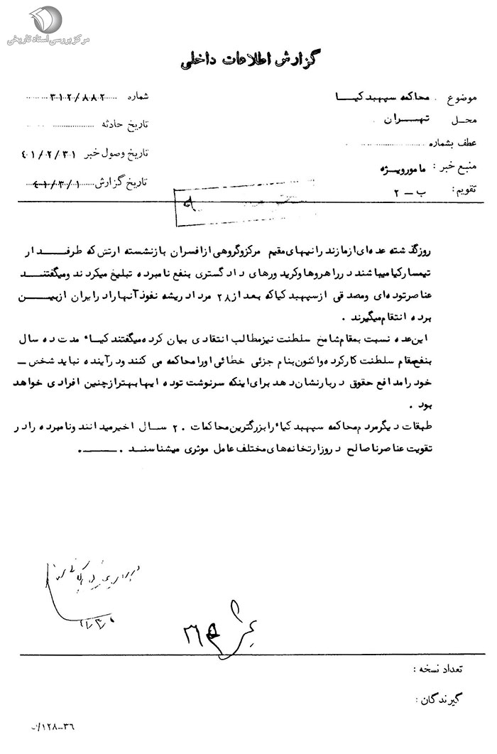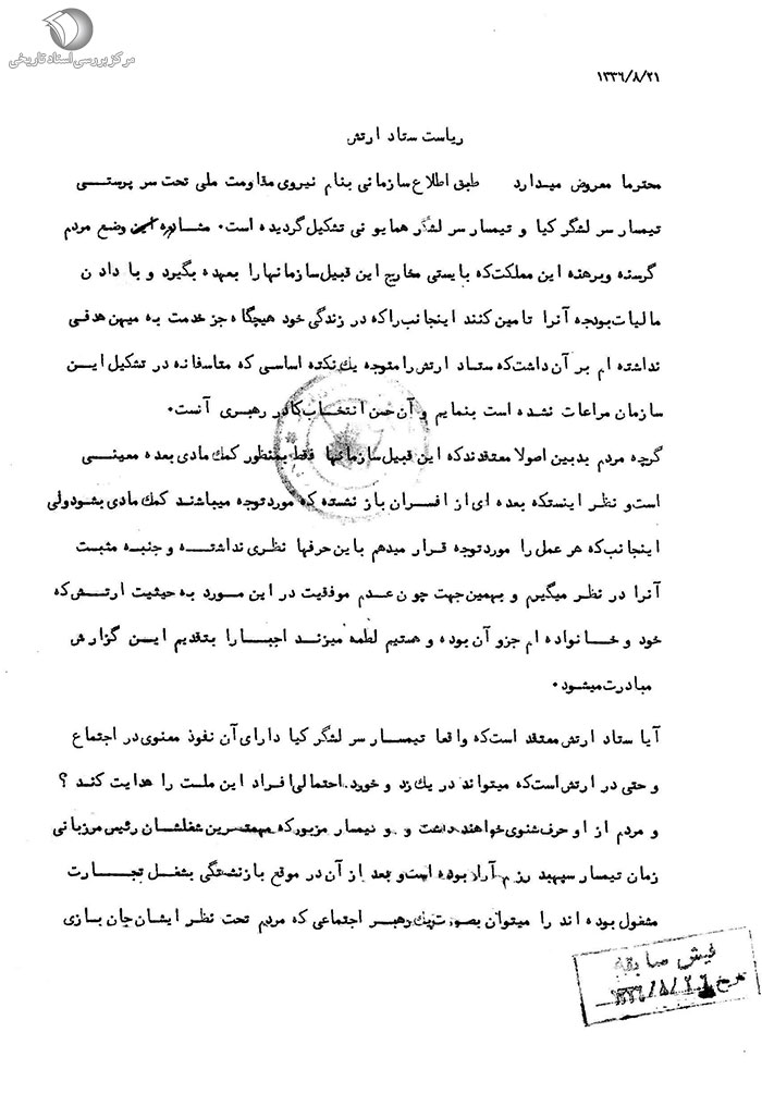 «این عده که فقط با تیمسار سپهبد کیا ارتباط دارند نظریات و برنامههای او را در مواقع لازم و ضروری مورد اجرا قرار خواهند داد.»[52]