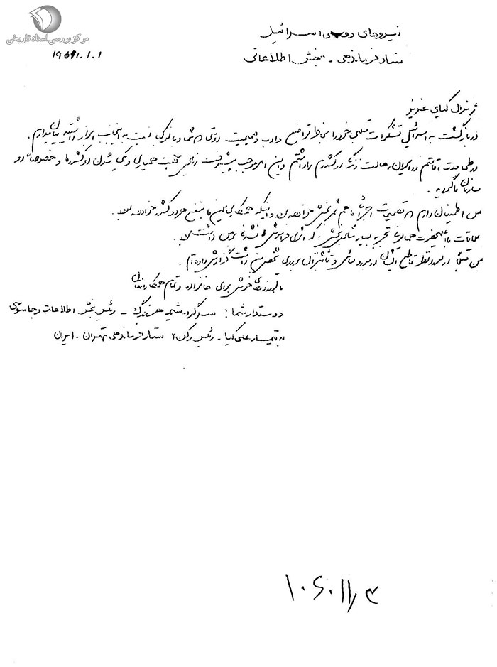 «هفته قبل نامهای به آقای ابهری نوشته و ضمن آن انتصاب حضرتعالی را که یقین نداشتم تبریک عرض کردهام البته این مقامات برای جنابعالی کوچکتر از آنند که قابل تبریک گفتن باشد ولی چون در موقعیت حساس توفیق خدمت بیشتر به میهن و شاهنشاه حاصل میشود لذا از این جهت برای برادران [اعضای سازمان کوک] موفقیت بزرگی است.»[21]
