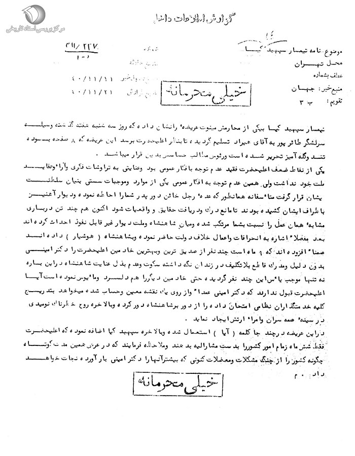 اگر در واقع آقایان استاندار و فرماندار در آذربایجان ماندنی و برنامه آنها تضعیف و از بین بردن احزاب و جمعیتهای ملی و شاهدوست میباشد امر ملوکانه صادر شود جاننثار را از آذربایجان تبعید نمایند تا اینکه ناظر مظالم و خیانتهای ایشان نباشم. اگر با امر ملوکانه اعتماد و توفیق شرفیابی حاصل شود مطالبی در این خصوص به عرض مبارک خواهد رسید.»[41]