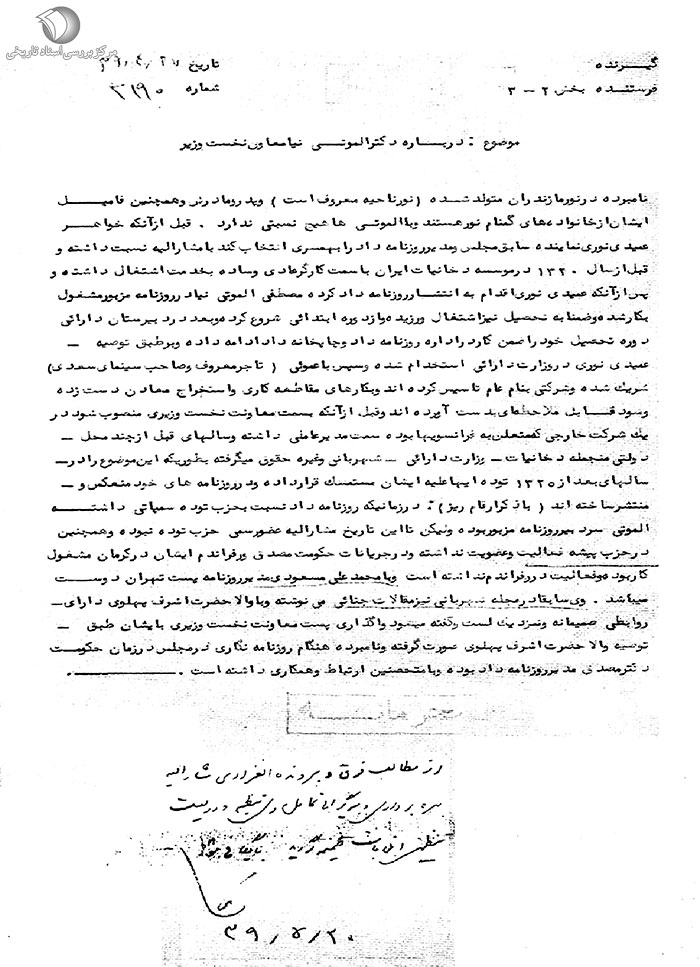 از مطالب فوق و پرونده انفرادی مشارالیه بهرهبرداری و بیوگرافی کامل وی تنظیم و در لیست تنظیمی انتخابات ضمیمه گردید. بایگانی شود. 20 / 5 / 39