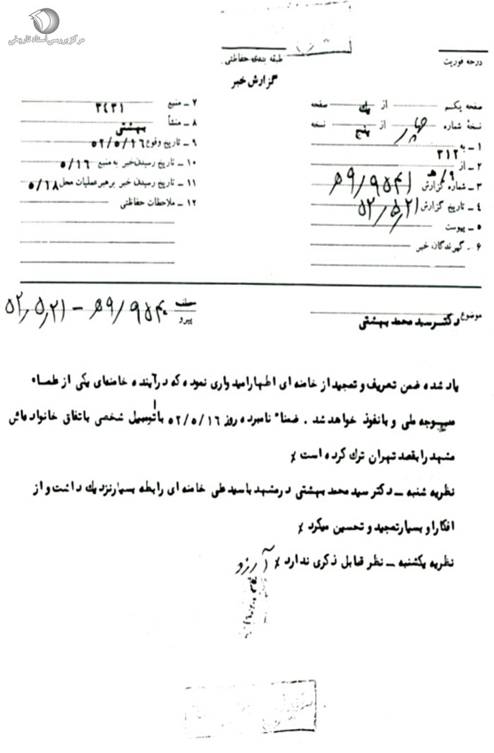یاد شده ضمن تعریف و تمجید از خامنهای، اظهار امیدواری نموده که در آینده خامنهای یکی از علمای موجه ملی و با نفوذ خواهد شد. ضمناً نامبرده روز 16 / 5 / 52 با اتومبیل شخصی به اتفاق خانوادهاش مشهد را به قصد تهران ترک کرده است.