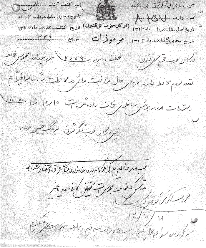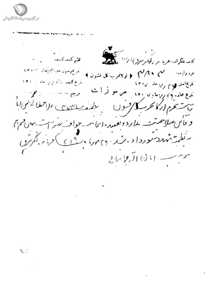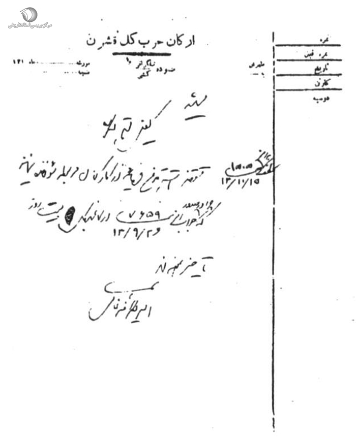 عطف به رمز نمره ۱۵۰۵ مورخ 15/۱۰ /13 مقتضی است قدغن فرمائید از کارکنان مربوطه مؤاخذه نمایند که چرا در صدور جواب رمز نمره ۷۶۵۹ مورخ 26 /9 /13 ارکان حرب کل، بیست روز تأخیر نمودهاند.
