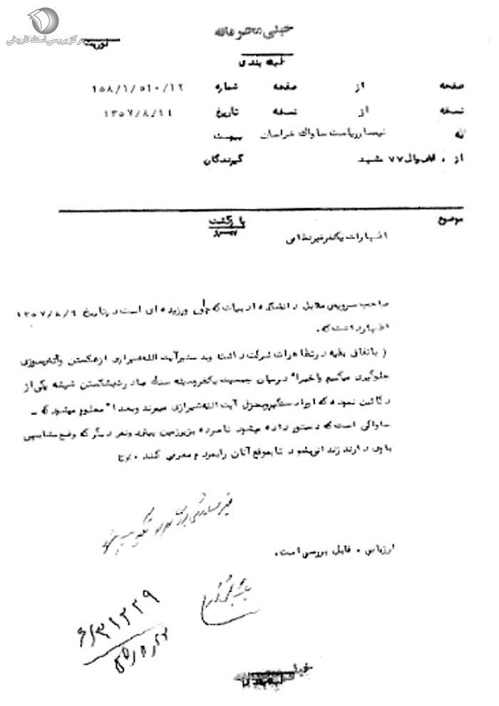 از: ا . ض و . ا. ل 77 مشهد به: تیمسار ریاست ساواک خراسان