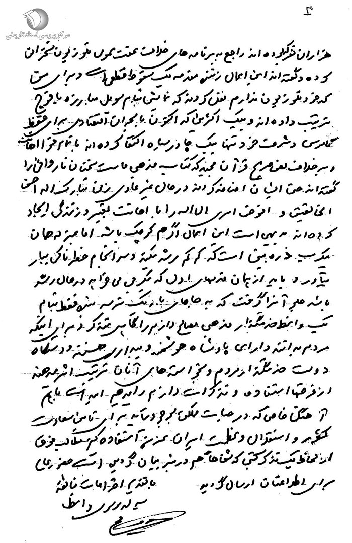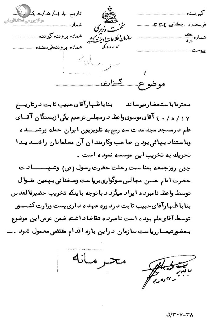 در مورد انتقادات آقای سید محمد موسوی واعظ در مسجد مجد، به فرموده تذکرات لازم به مشارالیه داده شد که در آتیه مراقب گفتار خویش بوده، تولید تشنج و ناراحتی برای اشخاص و دستگاههای انتظامی ننماید. نامبرده متقابلاً ضمن اظهار اطاعت به شرح شکوائیه تقدیمی پیوست عرضه داشته که تلویزیون ایران در برنامه خویش نمایش نامۀ[ای] تحت عنوان (سویل و مبارزه با قوچ) ترتیب داده که به مقدسات مذهبی ما لطمه وارد ساخته، عدۀ[ای] از مسلمین و وعاظ از اینجانب و آقای فلسفی واعظ خواستار شدند تذکر لازم به آنها داده شود و نظر خاصی در بین نبوده. ضمناً چند نفر از وعاظ روی خواسته سکنه محل، تمنا دارند آقای ثابت اقدامی نماید که لوله موتور کارخانه خود را مثل سایر کارخانجات در چاه قرار دهد که صدای آن تولید مزاحمت ننماید. علیهذا عین مشروحه آقای موسوی برای مزید استحضار و هر نوع اقدام مقتضی به پیوست ایفاد میگردد.