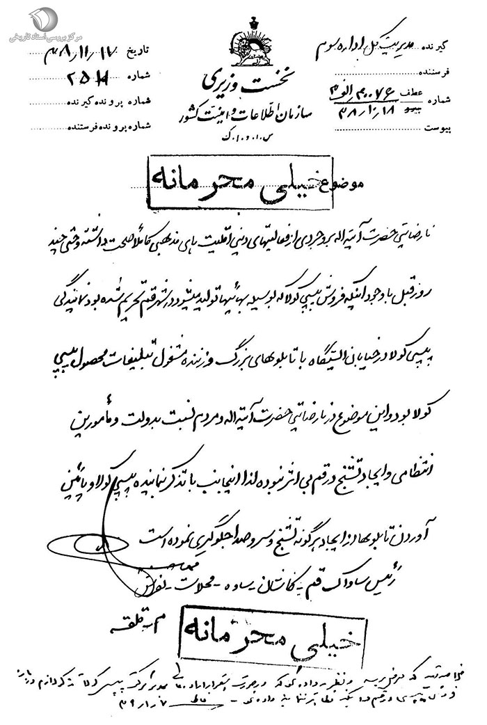 نارضایتی حضرت آیتاله بروجردی از فعالیتهای دینی اقلیتهای مذهبی کاملاً صحت داشته و حتی چند روز قبل با وجود این که فروش پپسیکولا که به وسیله بهائیها تولید میشود در شهر قم تحریم شده بود، نمایندگی پپسیکولا در خیابان ایستگاه با تابلوهای بزرگ و زننده مشغول تبلیغات محصول پپسیکولا بود و این موضوع در نارضایتی حضرت آیتاله و مردم نسبت به دولت و مأمورین انتظامی و ایجاد تشنج در قم بیاثر نبوده، لذا اینجانب با تذکر به نماینده پپسیکولا و پائین آوردن تابلوها از ایجاد هرگونه تشنج و سر و صدا جلوگیری نموده است.