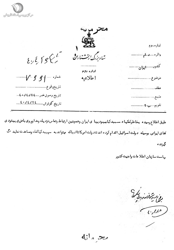 طبق اطلاع رسیده، به خاطر کمکهای سپهبد کیا به یهودیهای ایران و همچنین ارتباط و تماس نزدیک و مداوم وی با عزری، یهودیهای ایرانی به وسیله دولت اسرائیل اقدام کردهاند تا دولت آمریکا تا آنجا که میتواند به سپهبد کیا کمک و مساعدت نماید.