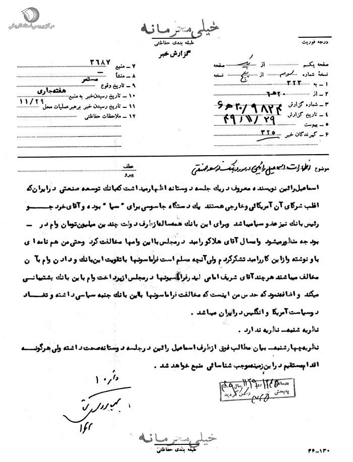 نظریه چهارشنبه ـ بیان مطالب فوق از طرف اسماعیل رائین در جلسه دوستانه صحت داشته ولی هرگونه اقدام مستقیم در این زمینه موجب شناسائی منبع خواهد شد.