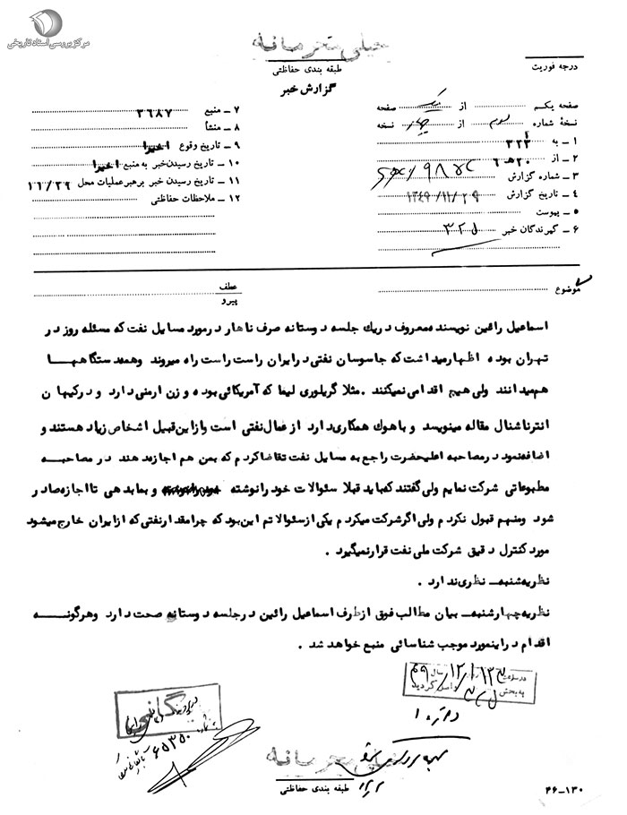 اسماعیل رائین نویسنده معروف در یک جلسه دوستانه صرف ناهار در مورد مسایل نفت که مسئله روز در تهران بوده اظهار میداشت که: «جاسوسان نفتی در ایران راست راست راه میروند و همه دستگاهها هم میدانند ولی هیچ اقدامی نمیکنند. مثلاً گریلوری لیما که آمریکائی بوده و زن ارمنی دارد و در کیهان انترناشنال مقاله مینویسد و با هوک همکاری دارد از عمّال نفتی است و از این قبیل اشخاص زیاد هستند» و اضافه نمود: «در مصاحبه اعلیحضرت راجع به مسایل نفت تقاضا کردم که به من اجازه دهند در مصاحبه مطبوعاتی شرکت نمایم ولی گفتند که باید قبلاً سؤالات خود را نوشته و به ما بدهی تا اجازه صادر شود و من هم قبول نکردم ولی اگر شرکت میکردم یکی از سؤالاتم این بود که چرا مقدار نفتی که از ایران خارج میشود مورد کنترل دقیق شرکت ملی نفت قرار نمیگیرد.»