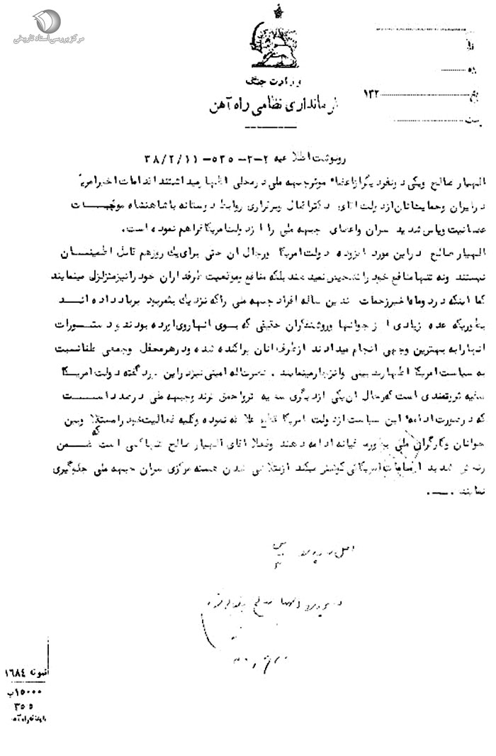 در پرونده اللهیار صالح بایگانی شود. 22 / 2 / 38