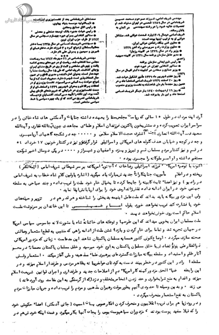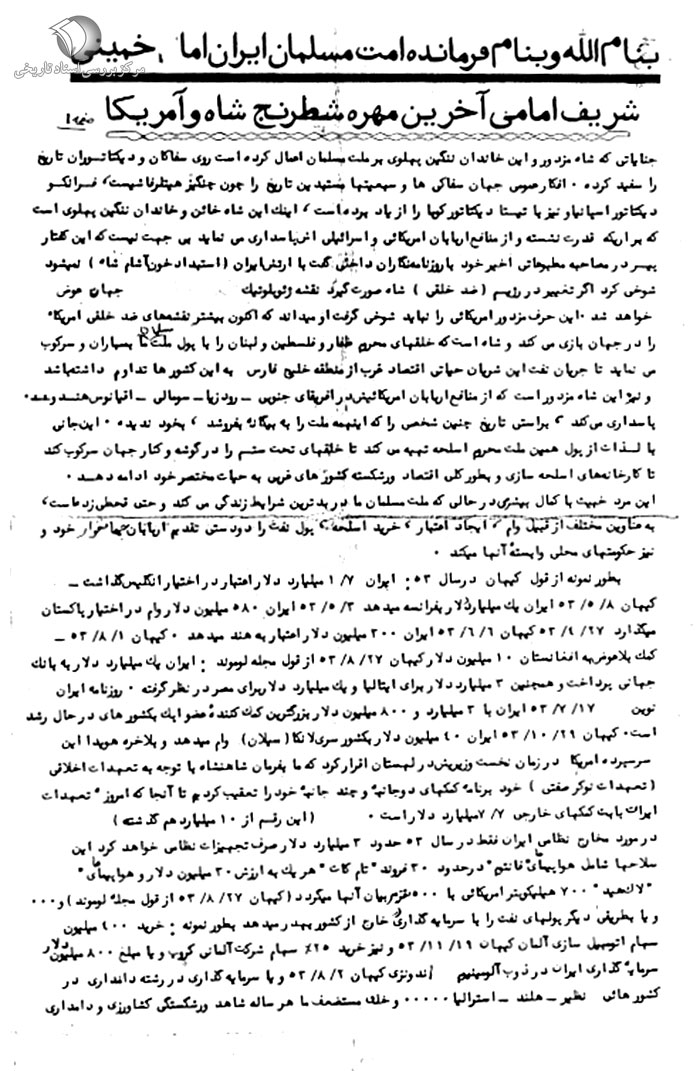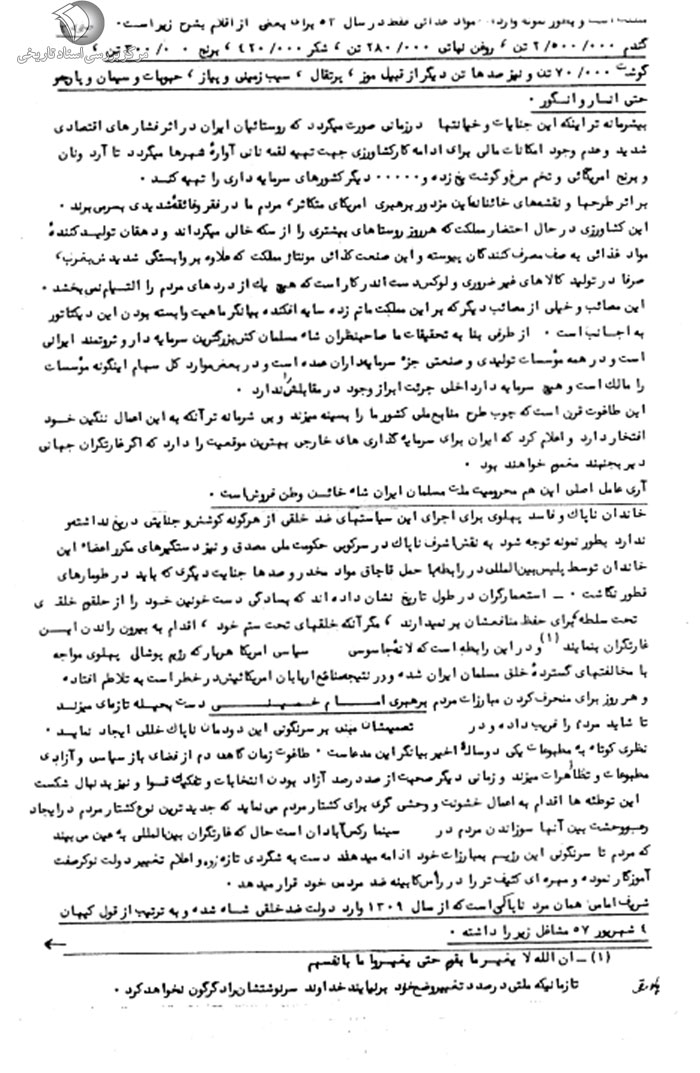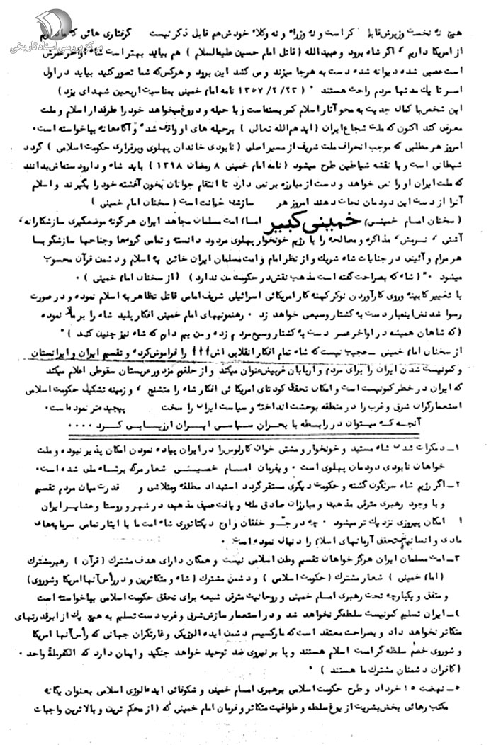 اعلامیه افشاگرانه درباره خیانتهای شاه، وضعیت کشور و نخست وزیری مهندس جعفر شریف امامی در مهر 1357