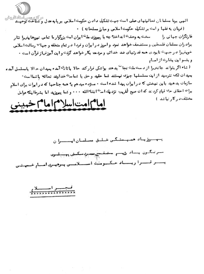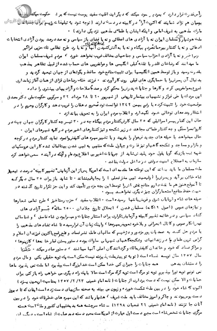 2ـ اگر رژیم شاه سرنگون گشته و حکومت دیگری مستقر گردد استبداد مطلقه و متلاشی و قدرت میان مردم تقسیم و با وجود رهبری مترقی، مذهبی و مبارزان صادق ملی و بافت عمیق مذهبی در شهر و روستا و عشایر ایران امکان پیروزی نزدیکتر میشود. چه در جو خفقان و اوج دیکتاتوری شاه، امت ما با ایثار تمامی سرمایههای مادی و انسانیاش تحقق آرمانهای اسلام را دنبال نموده است.