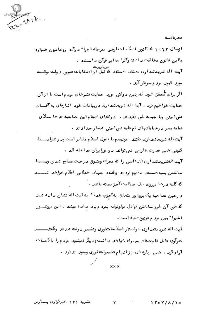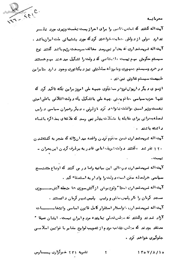 آیتاله شریعتمداری رهبر شیعیان ایران[!!!] امروز اخطار کرد: چنانچه هرچه زودتر دولت مورد قبول بر سر کار نیاید اعتصاب عمومی اعلام خواهد کرد. چنانچه تهدید آیتاله شریعتمداری به مرحله عمل درآید زندگی در ایران فلج خواهد شد و تأمین مواد غذائی مورد نیاز مردم متوقف خواهد شد.