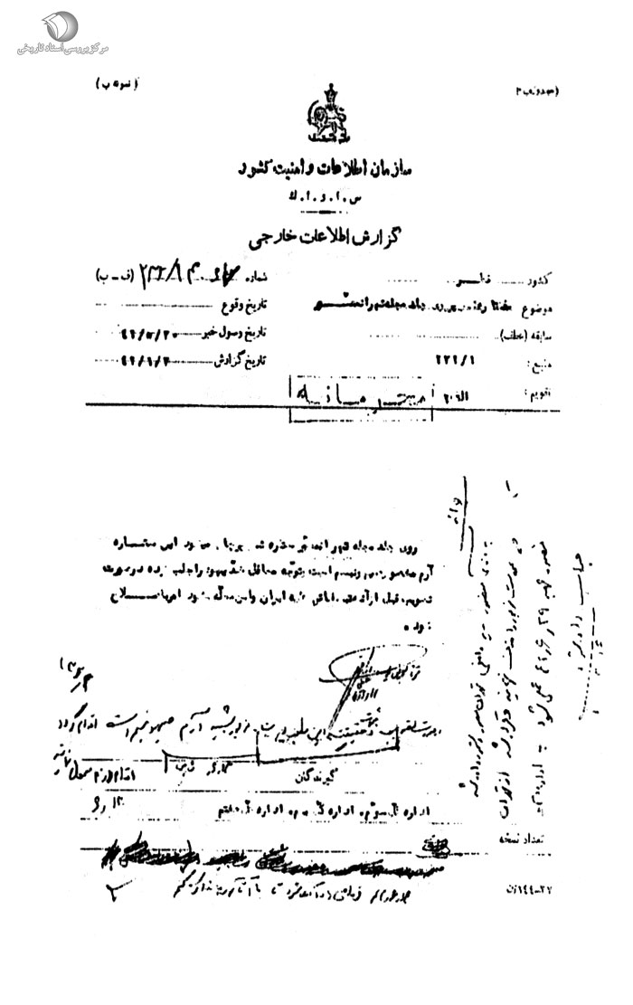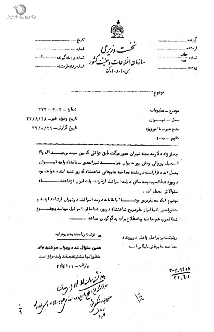 توضیح آن که سه نفر مزبور مرتباً با مقامات دولت اسرائیل در تهران ارتباط دارند و منظور اصلى آنها ابراز نظر صریح شاهنشاه در مورد شناسائى اسرائیل میباشد و موضوع شط العرب هم حاشیه و به اصطلاح براى رد گم کردن میباشد.