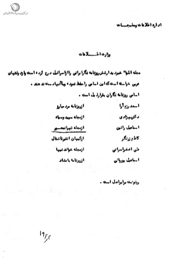 به مدیر داخلى مجله مزبور تذکر داده شد که ستاره ششپر (آرم مخصوص صیهونیسم) را از روى جلد مجله تهران مصور حذف نماید و قرار شد از شماره جمعه 29 / 6 / 42 عملى شود.