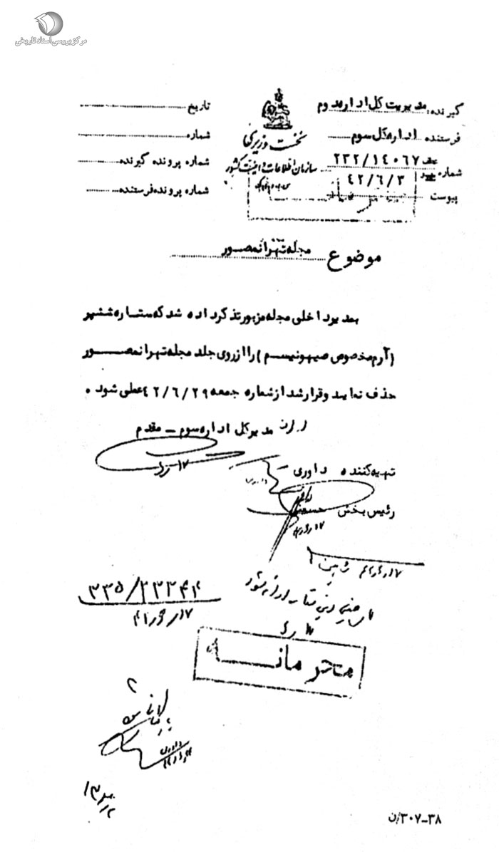 جراید ـ به آقاى منصور مدیر داخلى تهران مصور دستور داده شد که علامت مزبور را حذف نمایند و قرار شد از تهران مصور جمعه 29 / 6 / 42 عملى شود. به اداره دوم جواب داده شود. 14 / 6 /