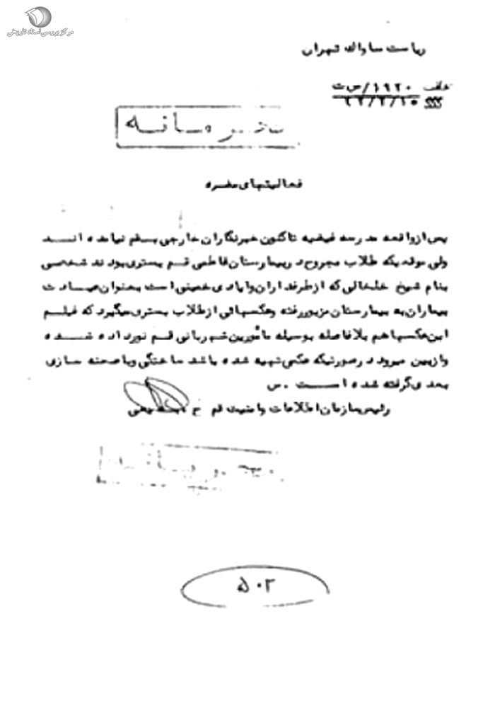 پس از واقعه مدرسه فیضیه تاکنون خبرنگاران خارجی به قم نیامدهاند ولی موقعی که طلاب مجروح در بیمارستان فاطمی قم بستری بودند شخصی به نام شیخ خلخالی که از طرفداران و ایادی خمینی است به عنوان عیادت بیماران به بیمارستان مزبور رفته و عکسهائی از طلاب بستری میگیرد که فیلم این عکسها هم بلافاصله به وسیله مأمورین شهربانی قم نور داده شده و از بین میرود در صورتی که عکس تهیه شده باشد ساختگی و با صحنه سازی بعدی گرفته شده است.