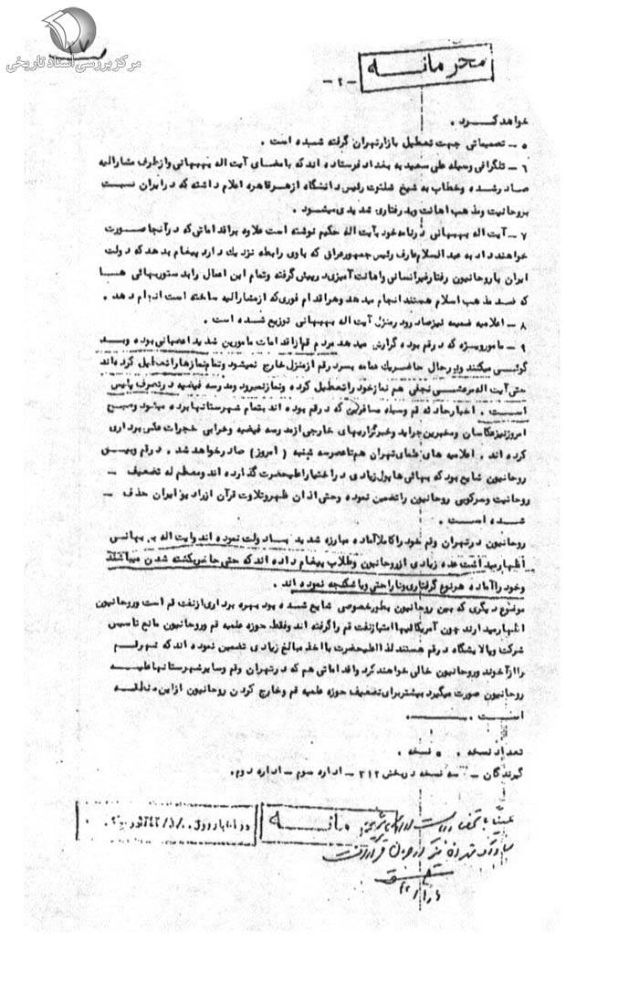 4ـ از طرف آیتاله بهبهانى تلگرافى به گلپایگانى ـ خمینى ـ شریعتمدار[ی] رفیع مراجع قم مخابره و از اعمال دولت اظهار تأسف و همدردى خود را اعلام داشته و جواب آیتاله گلپایگانى شب گذشته به تهران رسید و چون از دو نفر دیگر جواب نرسیده حدث[حدس] زدهاند که تلگراف آنها مخابره نشده است و لذا دیشب مجدداً نامه مفصلى از طرف آیتاله بهبهانى به سه نفر مزبور نوشته شده و آنها را دعوت به ایستادگى کرده و گفته است او نیز تا پاى جان از آنها پشتیبانى خواهد کرد
