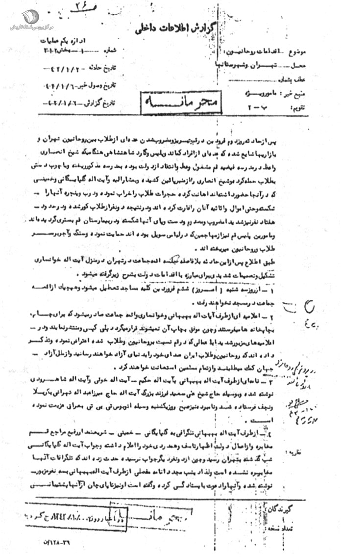 عیناً به استحضار ریاست اداره سوم میرساند. ساواک تهران نیز در جریان قرار گرفت. 6 / 1 / 42