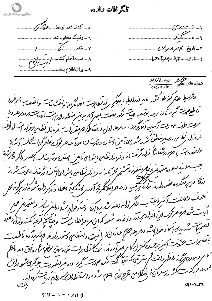 در شرایط حساس کنونى باید در رابطه با جلوگیرى از تظاهرات اخلالگرانه و اغتشاشات و اعتصابها برخورد قاطع صورت گیرد تا از بروز توسعه عملیات مذکور ممانعت به عمل آید بدین منظور لازم است اقدامات در دو مرحله و با سرعت ظرف 24 ساعت آینده آغاز گردد. در مرحله اول در نقاطى که مقررات فرماندار نظامى برقرار است از طرف فرماندارى نظامى در سایر مناطق کشور شوراى تأمین استان و شهرستان فوراً عناصر محرک و عوامل گردانندگان آشوبها و اعتصابات را که مورد شناسایى قرار گرفتهاند و فرماندار نظامى یا شوراى تأمین استان و شهرستان احضار و اگر حاضر نشدند جلب نمایند به علاوه معتمدین و عناصر ذىنفوذ و متشخص محترمانه به فرماندارى نظامى یا شوراى تأمین استان و شهرستان دعوت شوند در حالى که هر دو گروه حضور دارند موارد تحریکات هر یک از عناصر اخلالگر یادآورى و شدیداً اخطار و تذکر داده شود که از هرگونه عمل خلاف و مخالفتآمیز اجتناب و اگر ادامه دهند شدید با آنها رفتار خواهد شد. در این میان به معتمدین محلى اثبات شود که عناصر محرک این افراد هستند و اضافه شود که این مرحله اخطار است و چنانچه توجه نکنند و ادامه دهند تصمیمات شدیدى اتخاذ خواهد شد. در مرحله دوم سازمانهاى امنیتى و انتظامى دستور دارند که شدیداً و با قاطعیت با تظاهرات خشونتآمیز برخورد و کنترل کامل به عمل آورند. ضمناً تظاهرات ملى و میهنى موضوع شماره فوق باید با تنظیم کامل و بدون هرگونه بىنظمى و اغتشاش به ترتیبى که قبلاً گفته شده صورت گیرد و در غیر این صورت جلوگیرى شود در این مورد به وزارت کشور و سازمانهاى انتظامى شرح لازم اعلام شده و استانداران دستور لازم دریافت کردهاند.