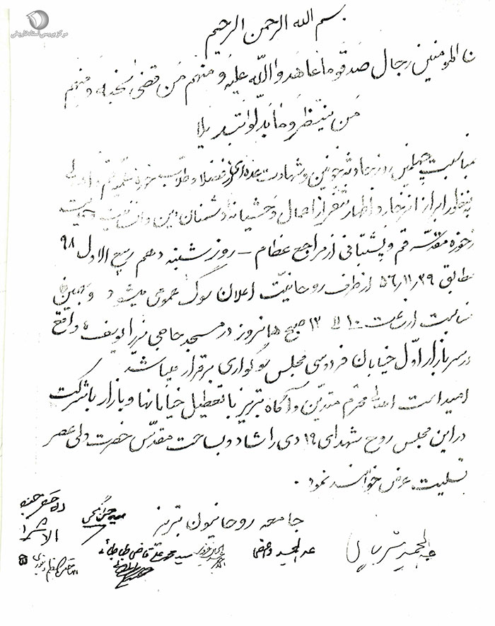 به مناسبت چهلمین روز حادثه خونین و شهادت عدهای از فضلا و طلاب حوزه علمیه قم [ناخوانا] به منظور ابراز انزجار و اظهار تنفر از اعمال وحشیانه دین و انسانیت و حیات در حوزه مقدسه قم و پشتیبانی از مراجع عظام ـ روز شنبه دهم ربیعالاول 98 مطابق 29 / 11 / 56 از طرف روحانیّت اعلان سوگ عمومی میشود و به همین مناسبت از ساعت 10 الی 12 صبح همان روز در مسجد حاجی میرزا یوسف آقا، واقع در سر بازار اوّل خیابان فردوسی مجلس سوگواری برقرار میباشد.